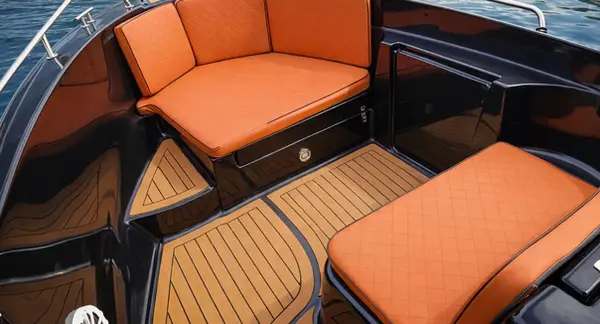 BLACK to elegancka łódź motorowa o nowoczesnej, dynamicznej linii, stworzona z myślą o wygodnym wypoczynku i przyjemnym pływaniu po jeziorach. Zwraca uwagę efektownym, ciemnym kadłubem zestawionym z kontrastową, pomarańczową tapicerką, która nadaje jej wyjątkowy i prestiżowy charakter.